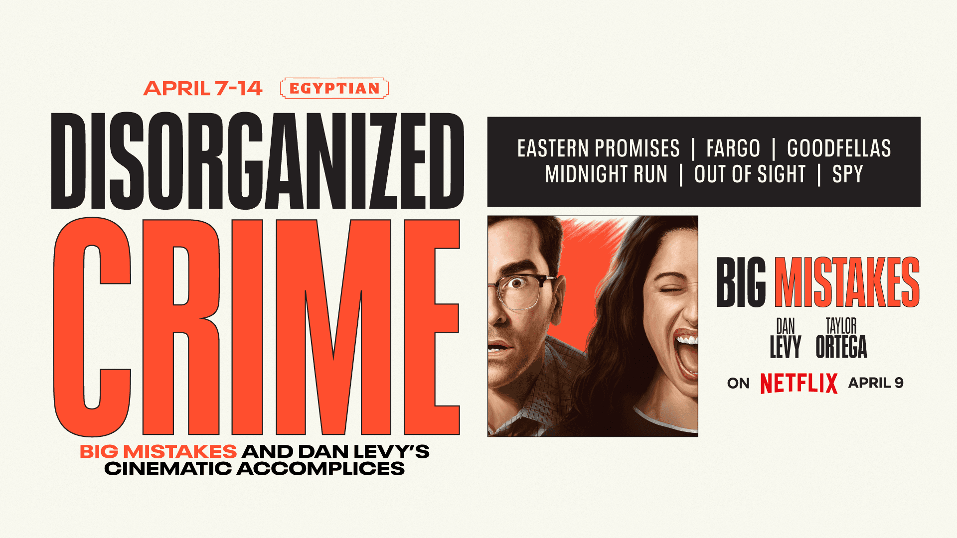 To celebrate the release of this new genre-bending series (available on Netflix April 9) that’s set against the backdrop of a suspenseful, high-stakes crime thriller while remaining laugh-out-loud funny, the Paris Theater is proud to present Disorganized Crime: Big Mistakes and Dan Levy’s Cinematic Accomplices, a film program curated by Big Mistakes co-creator, showrunner and star Dan Levy that highlights the cinematic inspirations behind the show’s unique blend of the crime and comedy.